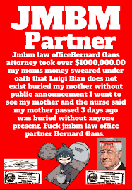 Suing JMBM partner $500,000,000,000.00 Busted criminal attorneys Jeffer Mangels Butler & Mitchell LLP lawyer Bernard Reginald Gans #57068 Bernard Gans Mina Sirkin law group JMBM killed my mom to get her fortune.Suing JMBM partner $500,000,000,000.00 Busted criminal attorneys Jeffer Mangels Butler & Mitchell LLP lawyer Bernard Reginald Gans #57068 Bernard Gans Mina Sirkin law group JMBM killed my mom to get her fortune.
